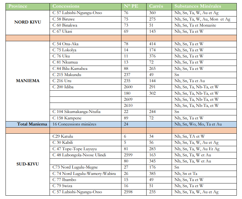 En termes géographiques, 47,5 % des réserves sont contenues dans les concessions du Maniema ; 47,5 %, dans les concessions du Sud-Kivu et enfin, 5 %, dans le Nord Kivu. Voici donc le tableau qui reprend ces données sur les carrés miniers et la réserve.